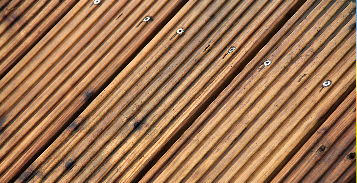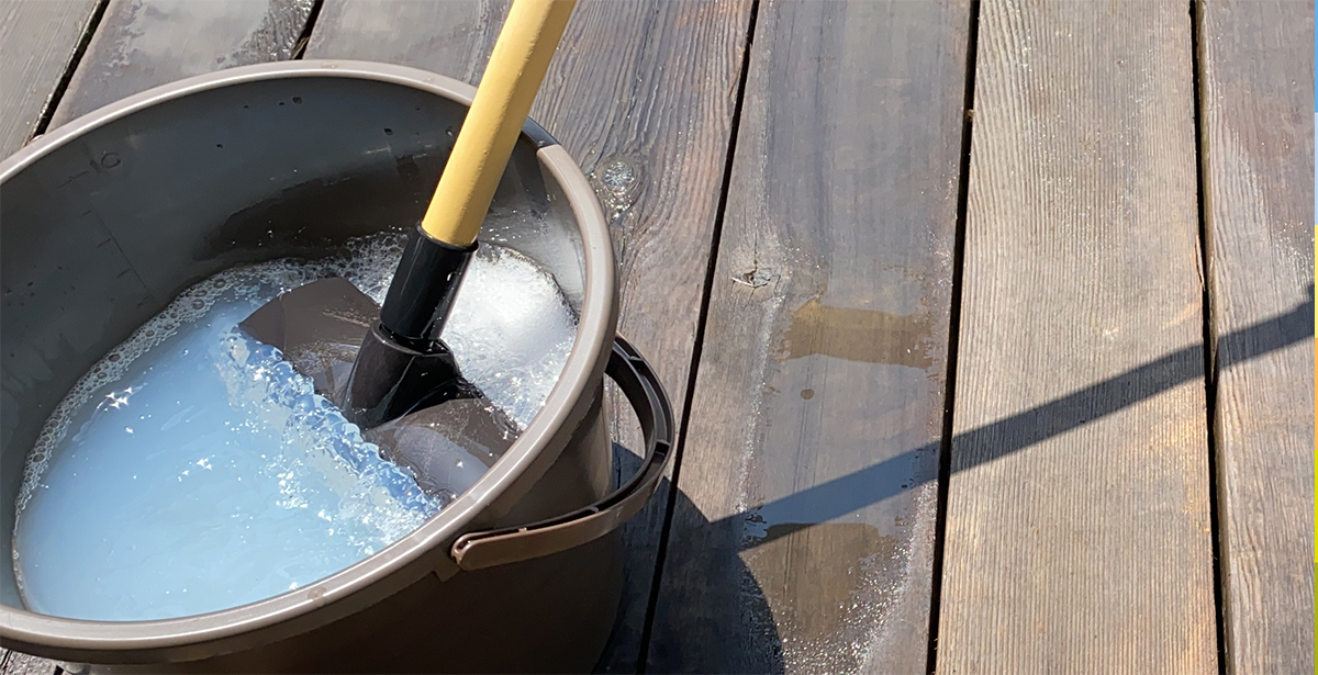 ウッドデッキを水で濡らし、デッキブラシ等に希釈液をつけ、木材繊維を傷めない程度に擦って汚れを落とします。